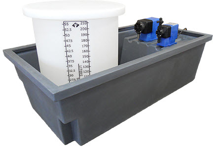 The ChemFeed Bin is designed to safely contain your single walled tank and provide an integral mounting pad for your chemical metering pumps or other equipment.