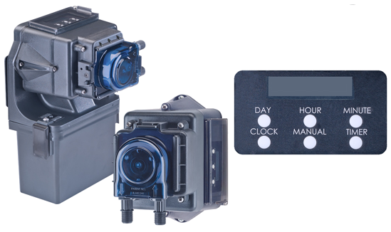 The Econ T and TD pumps provide automatic injection and offer flexibility to program a customized dosing schedule for light duty applications. Program up to 24 independent On and Off events within a 7 day period. Each event can be set for a specific On and Off time for each selected day or days of the week. The timer is programmed in hour and minutes increments. A battery is included as back-up to power loss to maintain the time and programmed events.